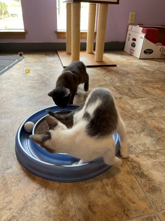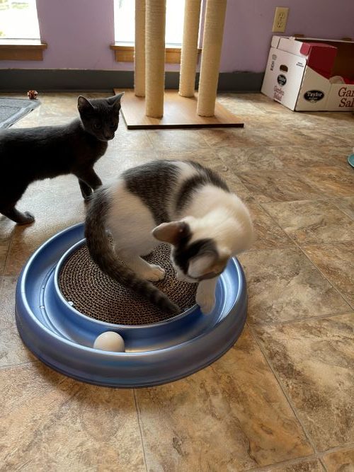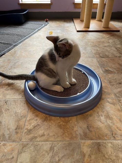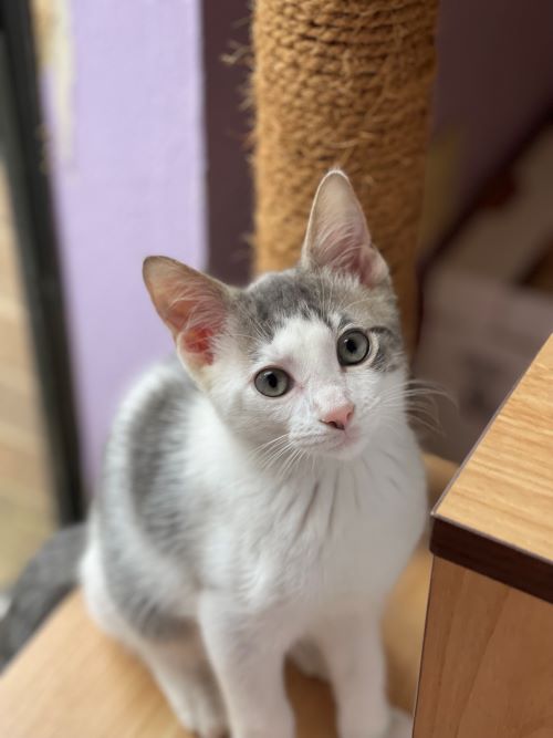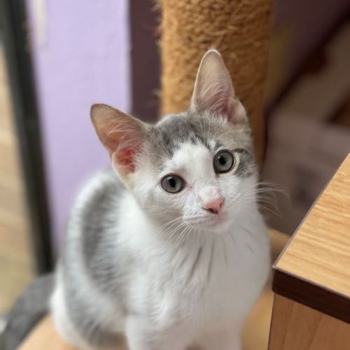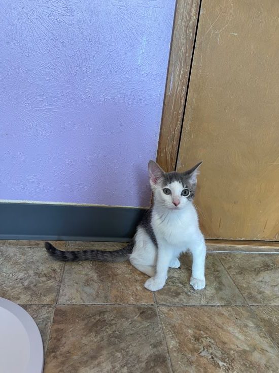Meet Prince Aspen! Aspen is a sweet little white with grey tabby waiting patiently for his forever family. Aspen spends his days playing with his toy springs, watching the bird out the window and playing with his brothers and sister. He loves dinner time, nap time, and snuggle time. This little man will sit in your lap purring while being petted and scratched. He is also quite talkative and likes to meow his wishes to you. Aspen has been around older cats.