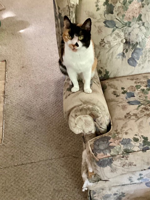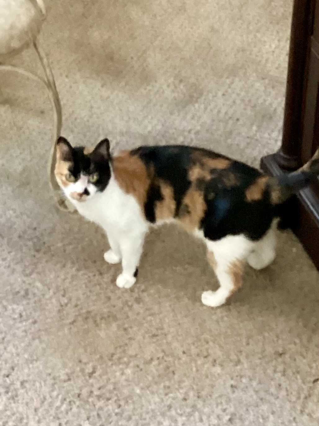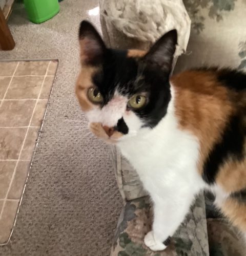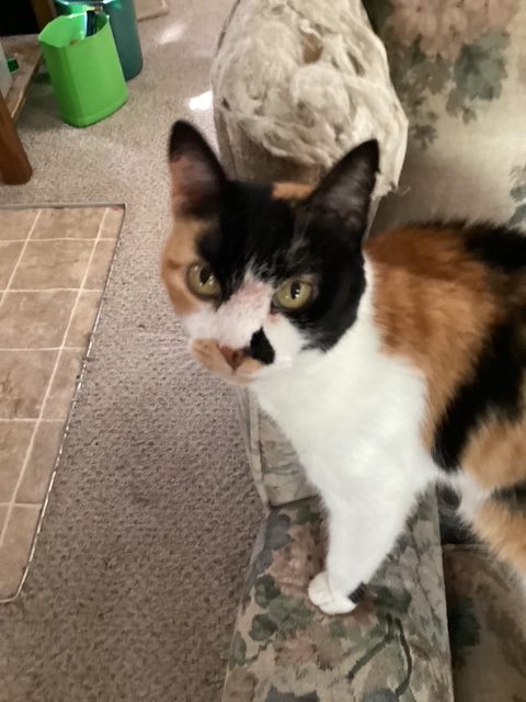 Meet Cali!  Cali is a spunky petite calico girl who is super friendly and waiting on her new forever family.  Cali currently needs a new home because her caregiver is unable to care for her any longer due to dementia.  She is a good girl and well behaved.  You would never know Cali is a senior girl.  She is quite small weighing in at a whopping 7lbs and is very energetic and playful!  She loves attention and pets and will hop up next to you for some love and affection.  Cali is quite talkative and loves human interaction.  Cali has had a recent check up and is FeLV/FIV neg and is up to date on all her shots.  Come and meet Cali today and add some love and fun to your family!