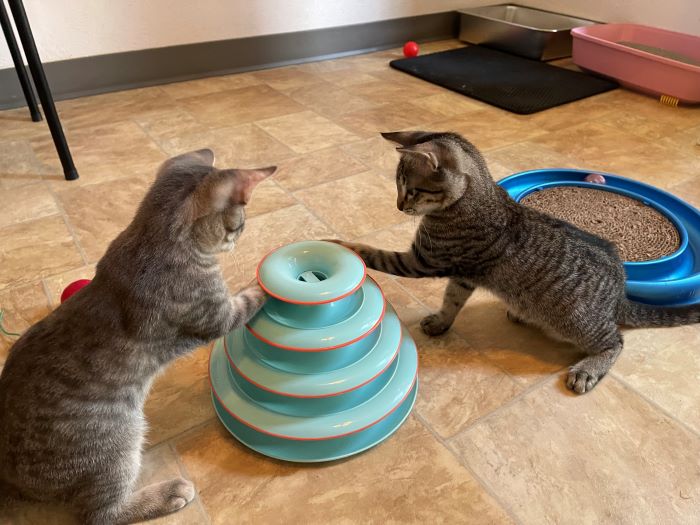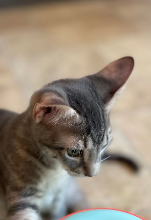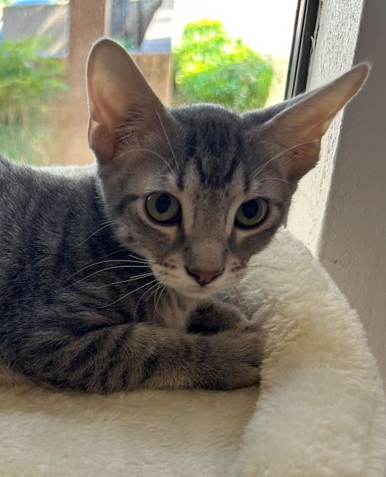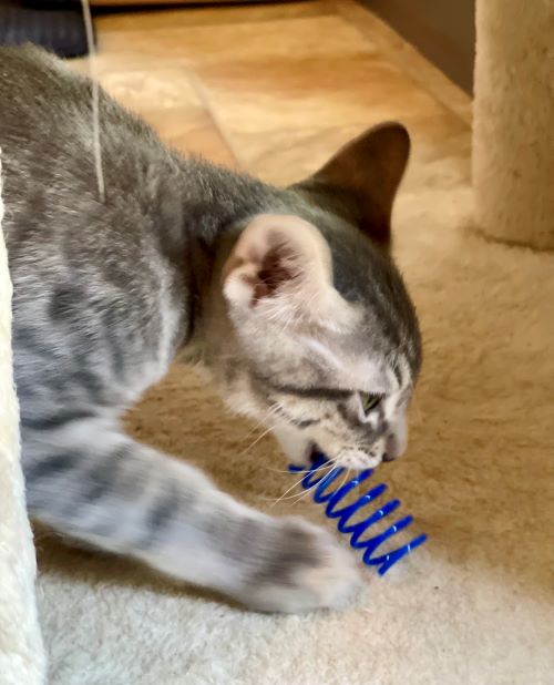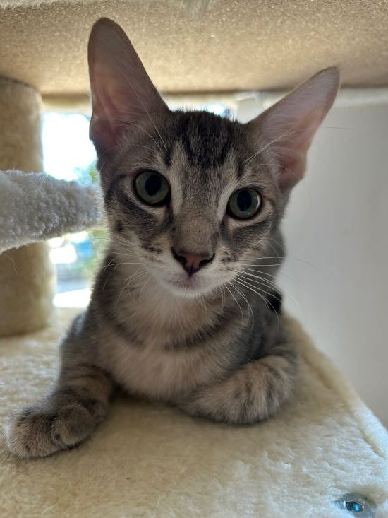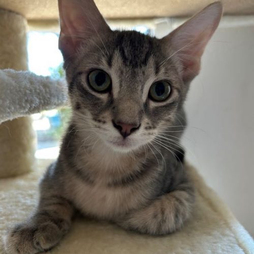 If you are a tabby fan George is a must to meet. George is the sweetest boy who will roll over and show you his belly! He has light gray/silver tone stripes and prominent ears. Its the new Devon Rex look alike trend in this litter. He is famous for his ball batting ability and has been caught on camera playing with his brothers, batting the ball back and forth on the track. Literally rallying back and forth. He has a large family and has been around adult cats. Best tabby ever!