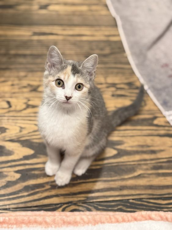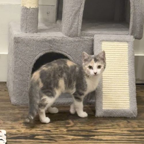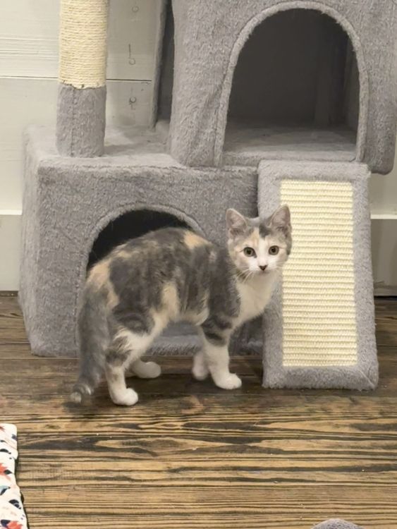 Ivy is a quiet and observant little lady with a soft dilute calico coat. She's smart, gentle and enjoys playing in a thoughtful way. While she may be a bit reserved at first, once she warms up, you’ll discover her sweet and curious personality. Ivy is litter trained, has a healthy appetite (especially for wet food!), and loves cozy spots to rest. Ivy shares a special bond with her sister, Fern, who balances her calm nature with lively, energetic companionship. The two are often cuddled up together or chasing each other around their playroom. They would do best in a home where they can stay together and let their unique personalities continue to blossom in harmony.