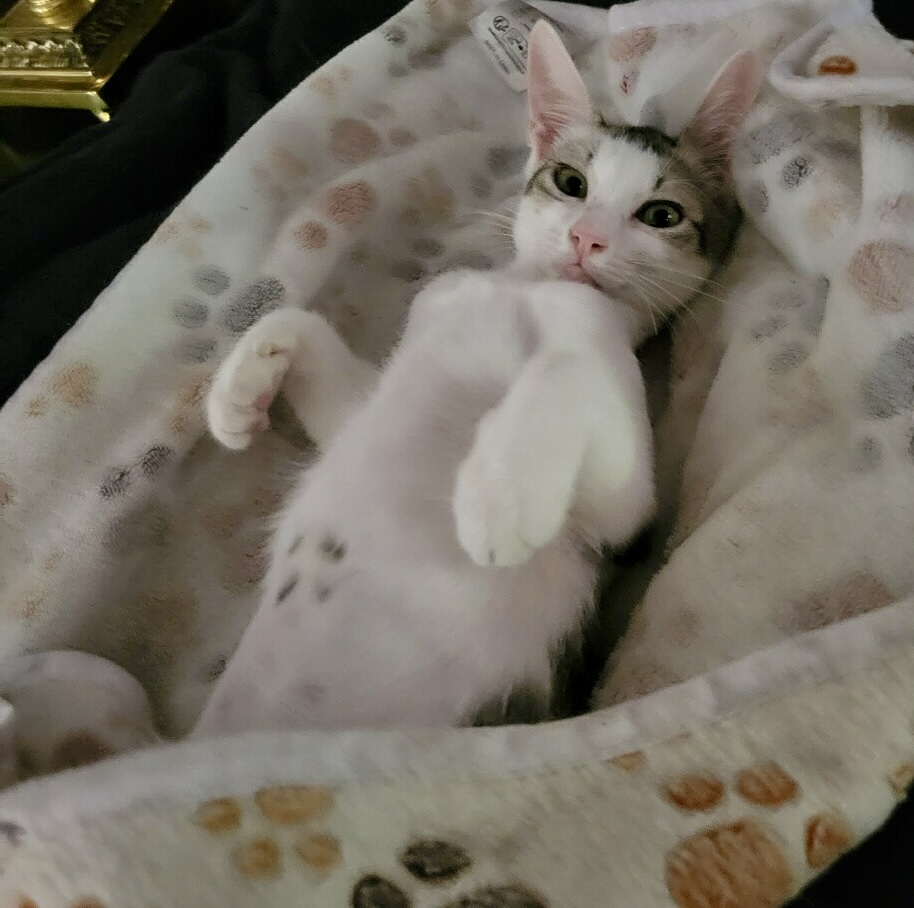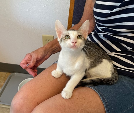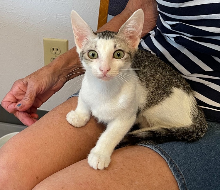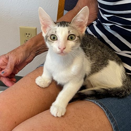 Marta is a quiet and observant little lady with a white coat and gray tabby markings. Her ears are a bit large and resemble the Devon rex look! Marta is smart, gentle and enjoys playing in a thoughtful way. You will soon discover her sweet and curious personality. She loves cozy spots to rest, especially on your lap. Marta shares a special bond with her 5 brothers and sisters. But is able to handle herself without their influence. If you are interested in Marta or Marta Plus1, please hurry and apply to meet her.