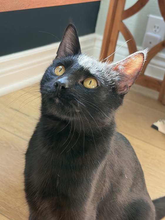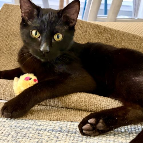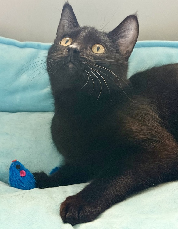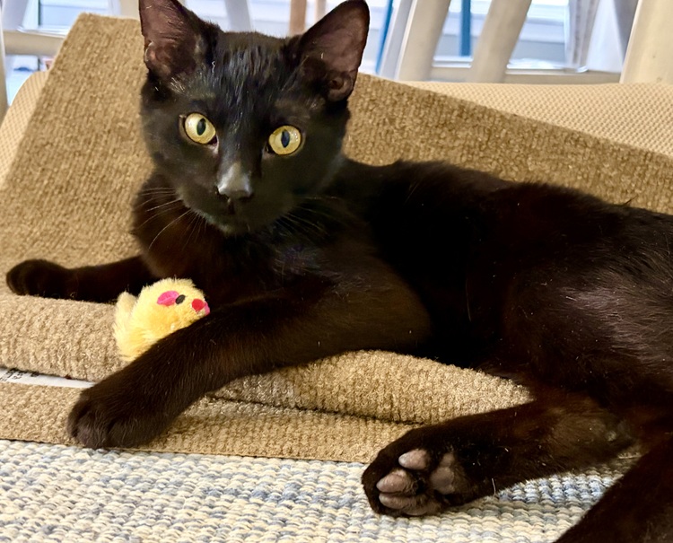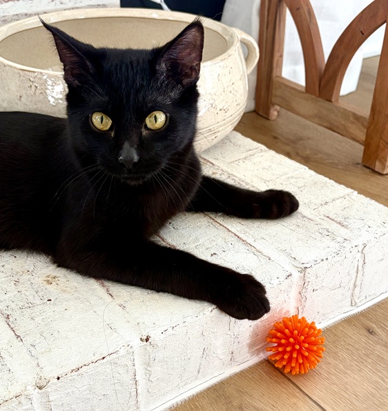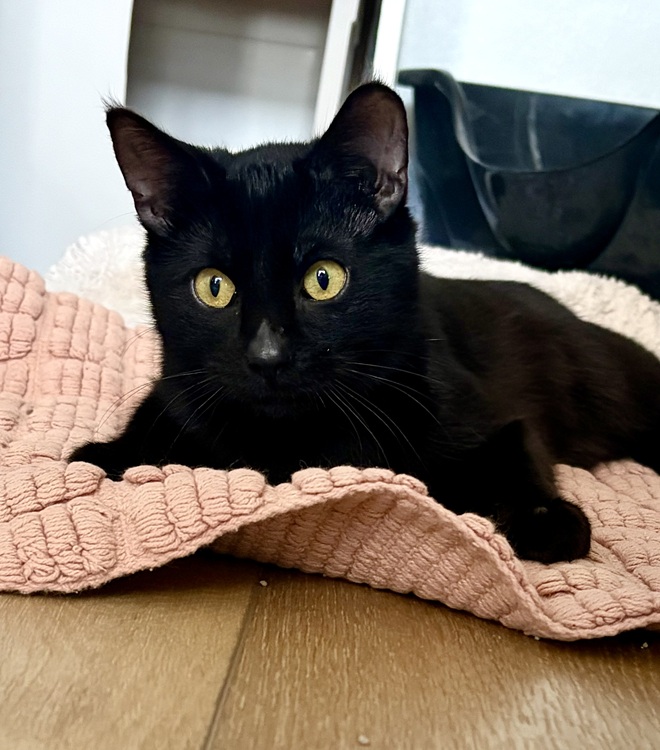 Max(born ~9/18/25) is a sleek black explorer with a big heart—affectionate when he wants to be, and otherwise on a mission to investigate every corner of the house. He’s playful, curious, and happiest with interactive toys, fluffy mice, and short bursts of attention before settling in for a cuddle. Neutered, vaccinated, and microchipped, Max would thrive in a home that can match his energy and give him plenty of chances to play and then relax. He has excellent manners and respect for other cats. If you are looking for siblings, Mae and Max would be a great pair but can be easily adopted as singles.