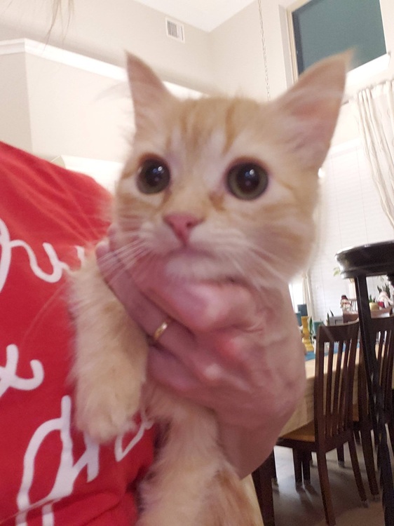 Well, just look at him now!!! He's 6 mos old now & he's transformed into a gloriously beautiful orange fluffernutter. He's still small for his age, but he's healthy and his fur is silky smooth. And those big beautiful eyes!!!