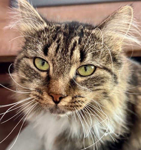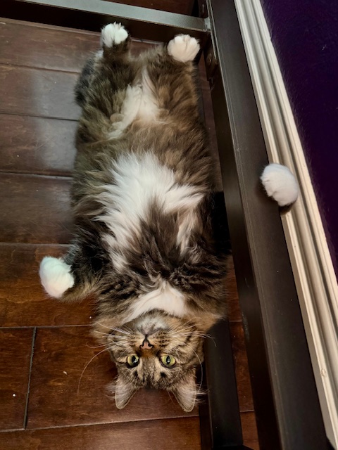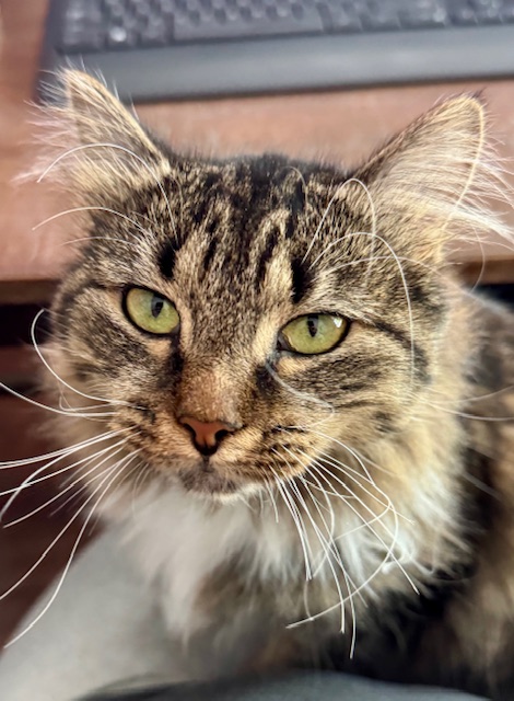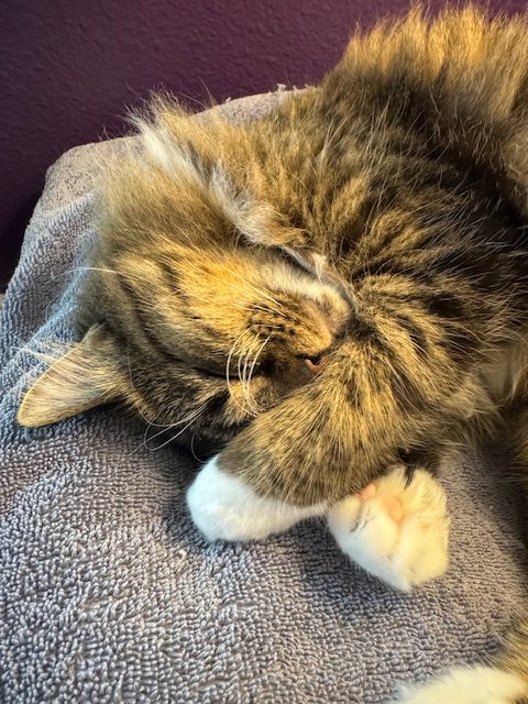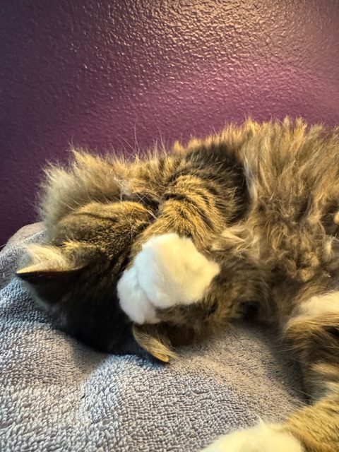 She has been to the vet multiple times and has been well behaved there. I can’t say she enjoys the carrier but will let me put her in it and is quiet in the car. Stumpy lets me clip her claws, usually a paw at a time. Little Stumpy is looking for a lap to curl up in and a home to run around in.