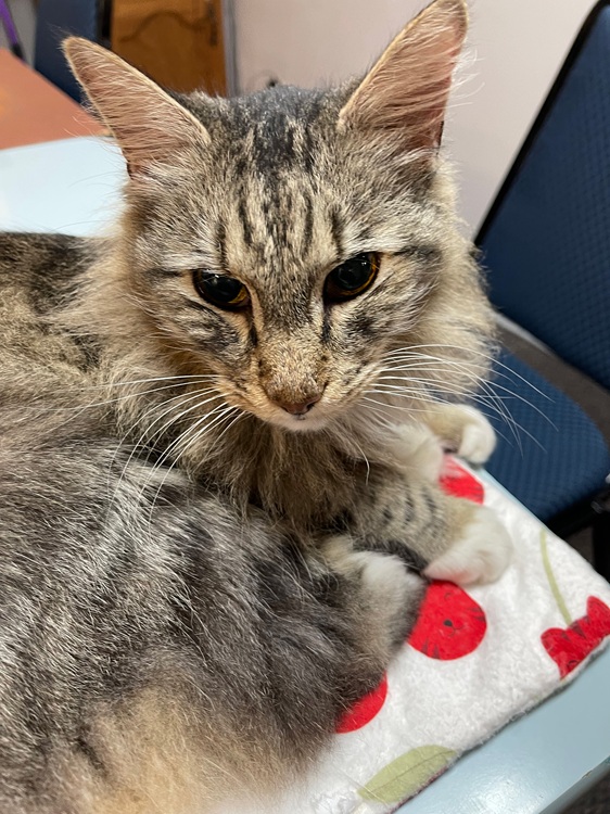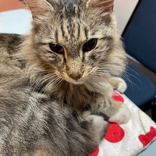 If you're looking for a cat who checks every box, say hello to Sue Ellen. Sweet? Absolutely. Affectionate? You bet. Mature and mellow with just enough spunk to keep things interesting—but never pestering. Her beautiful long, fluffy tail is as expressive as she is, and her blend of silky long and short tabby fur makes her a true original. Best of all? She gets along famously with other cats.